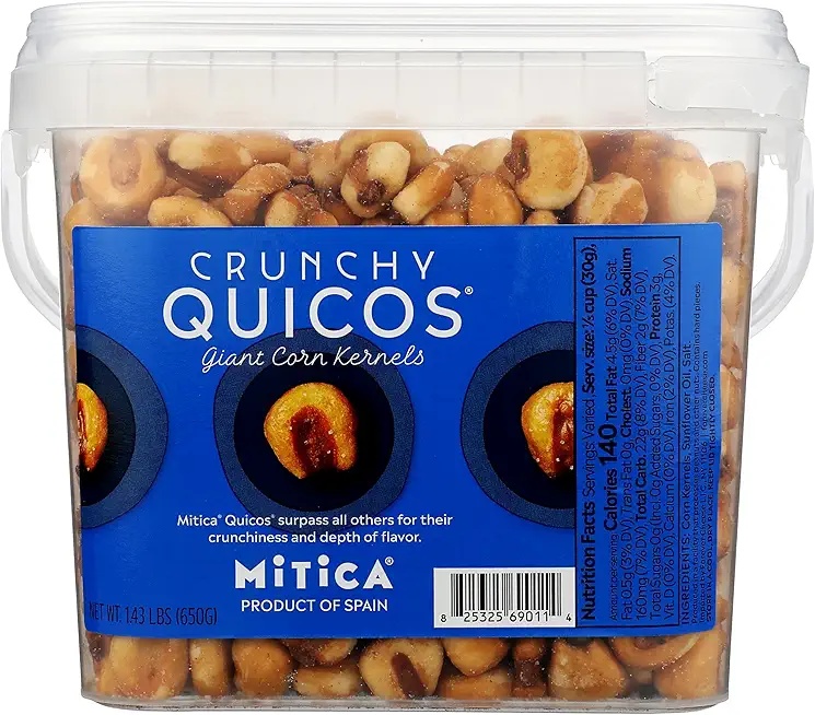 Discover the addictive Spanish delicacy - Quicos (toasted corn kernels) in a convenient 650g prepacked bucket. These large, crunchy corn kernels are seasoned to perfection with just the right amount of salt, creating an irresistible snack that pairs wonderfully with cheeses and charcuterie. Freshly toasted for maximum crunch and flavor, Quicos make an excellent alternative to traditional chips or popcorn. Their generous size and satisfying texture make them a favorite for entertaining or enjoying as a gourmet snack. This large bucket ensures you always have this beloved accompaniment ready for your next cheese board or casual gathering.